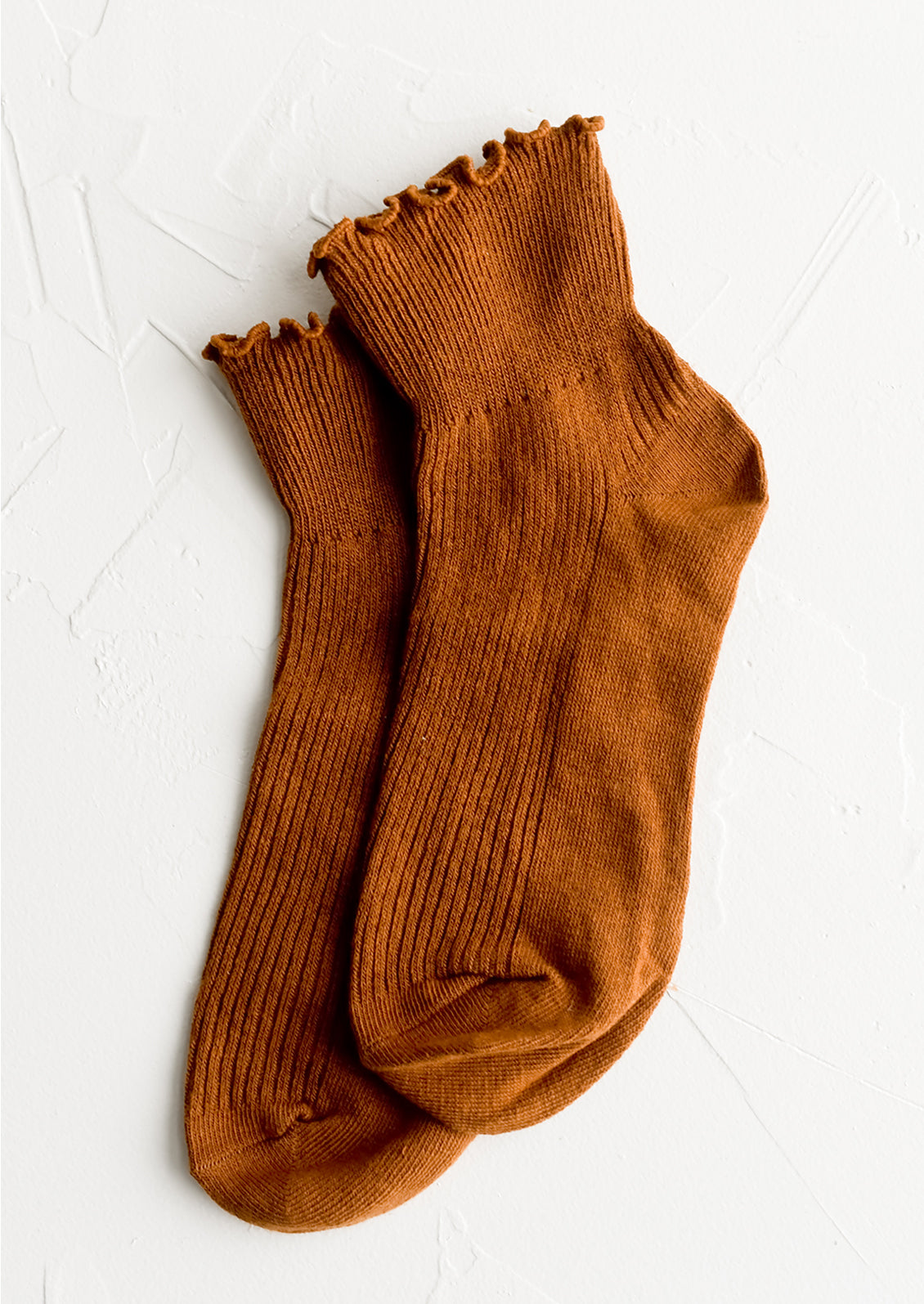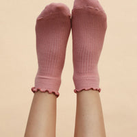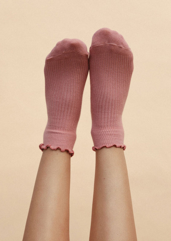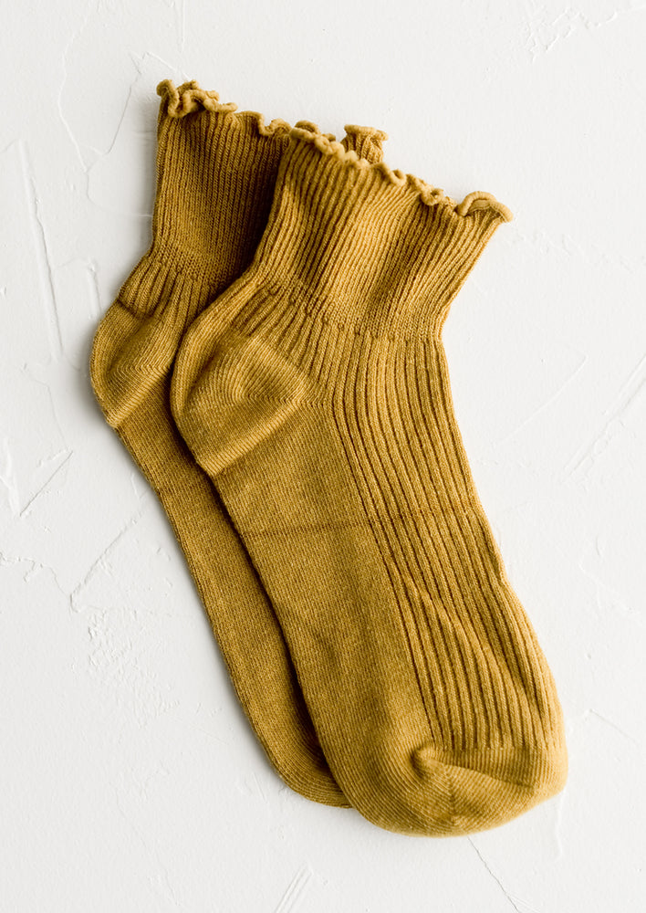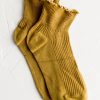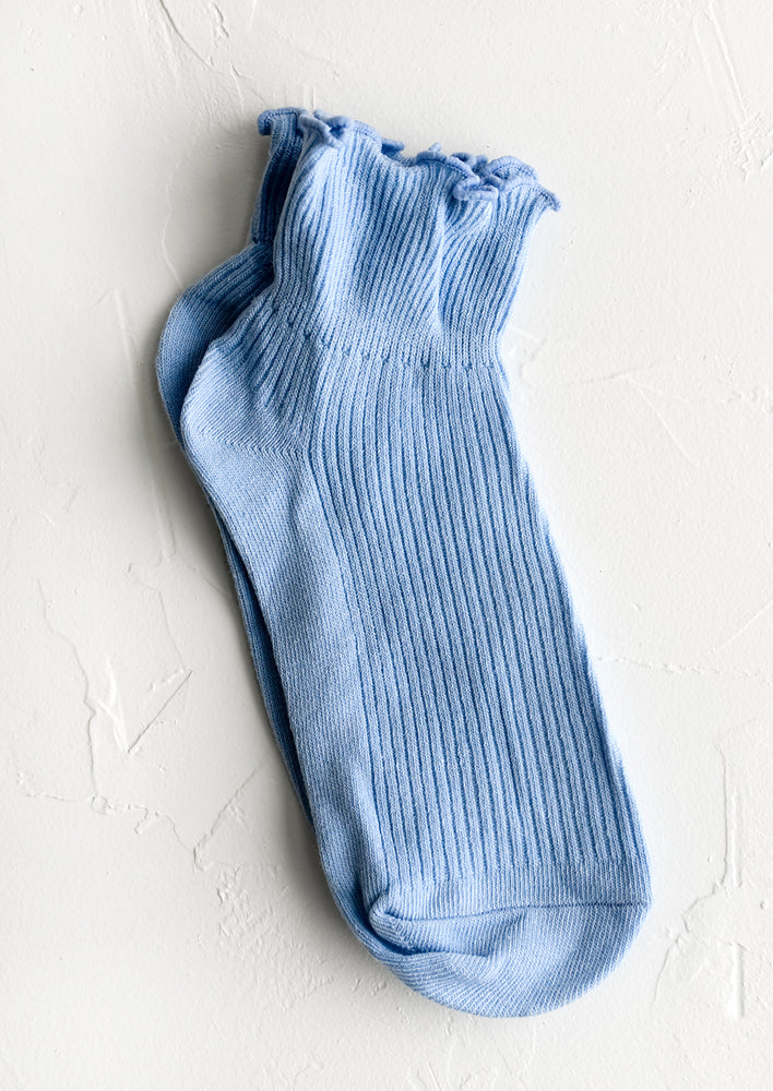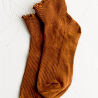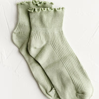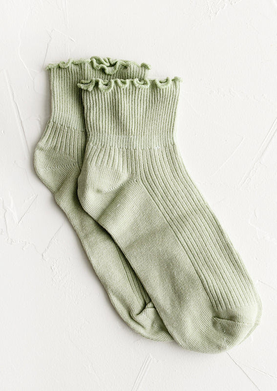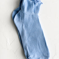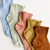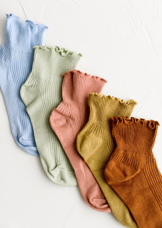 Hitting right at the ankle, these flattering, feminine socks come adorned with a ruffled edge, offered in five muted candy-like colors.