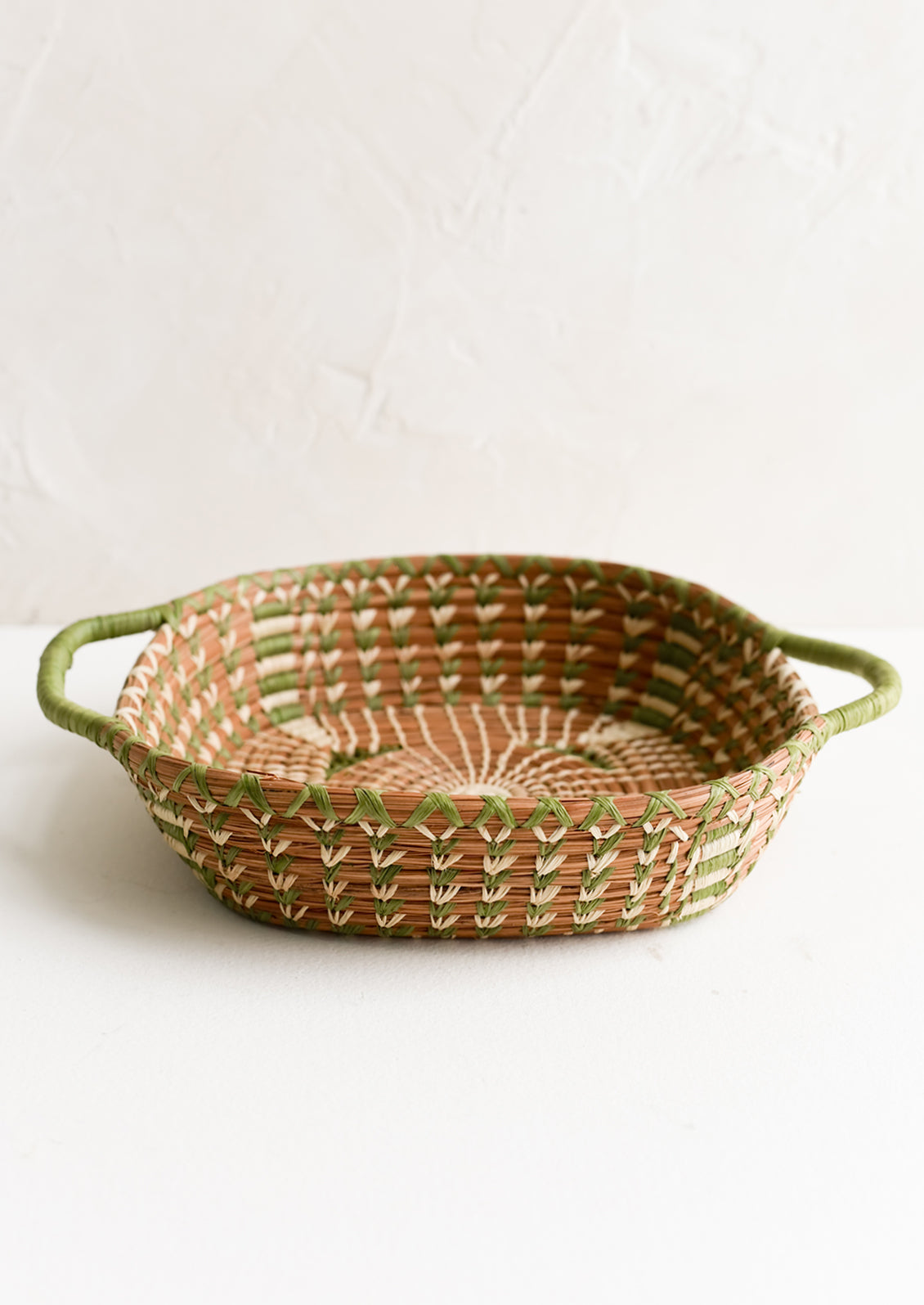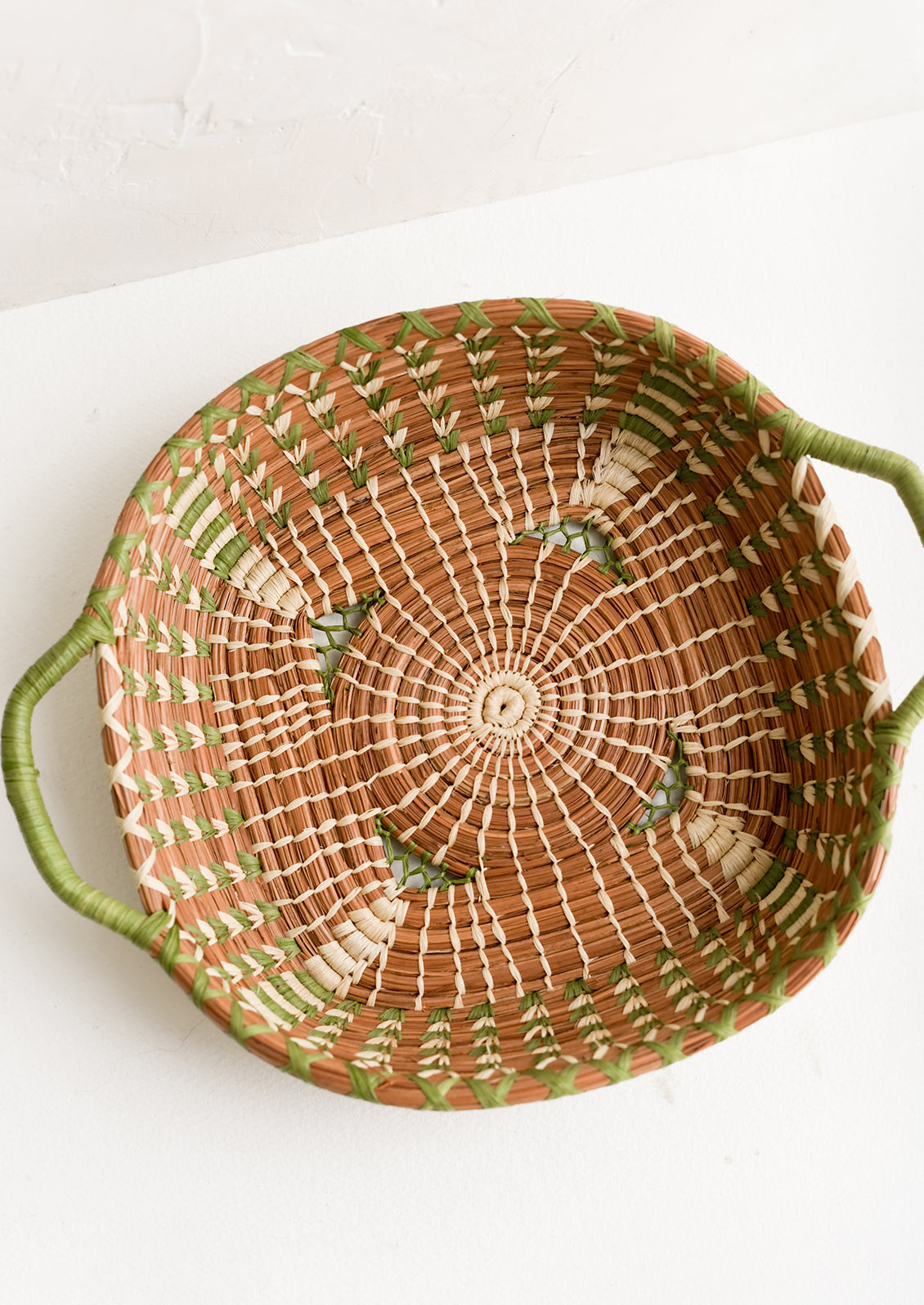 Made from dried pine needles interlaced with natural raffia, this shallow basket allows for endless storage and serving possibilities.