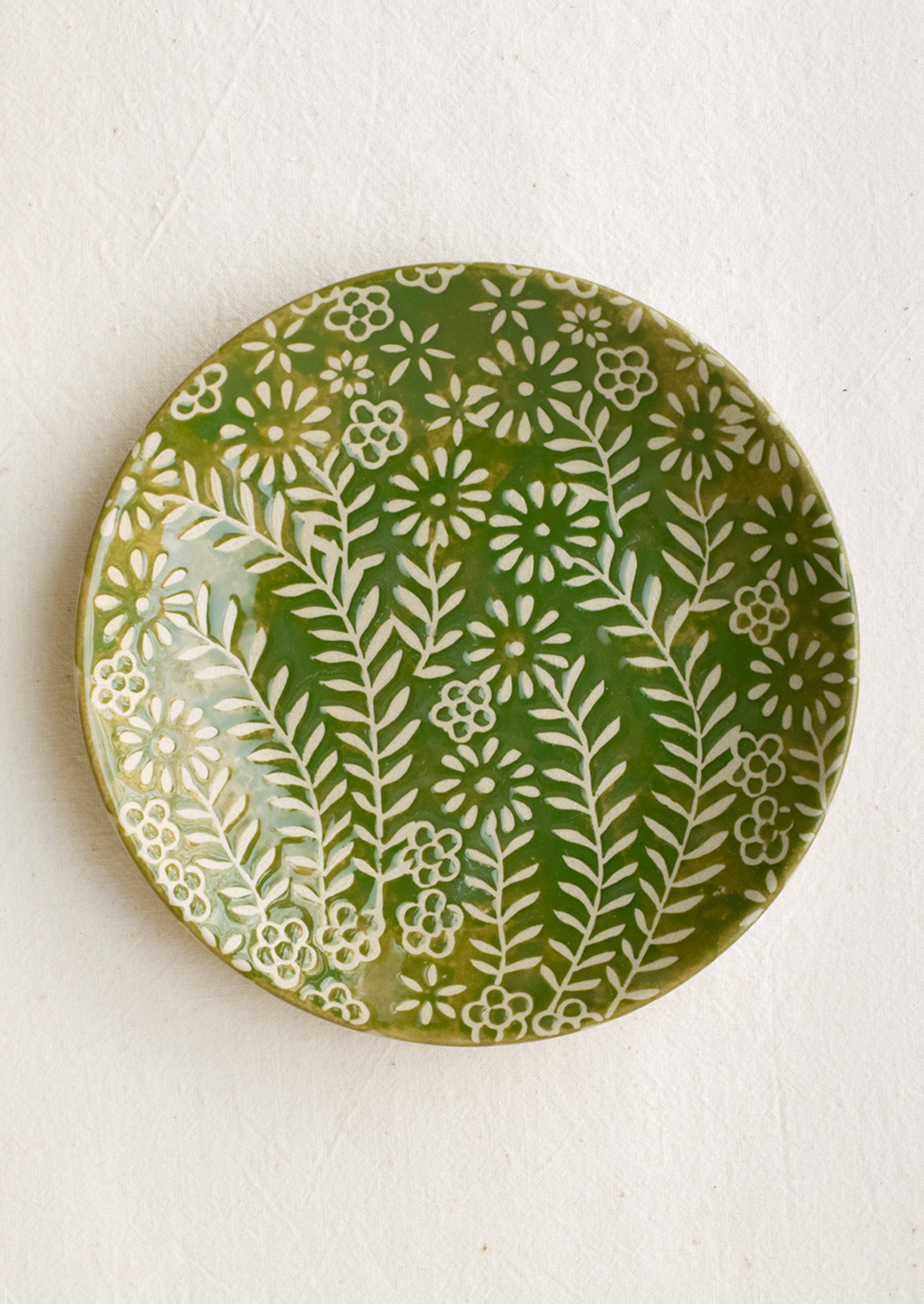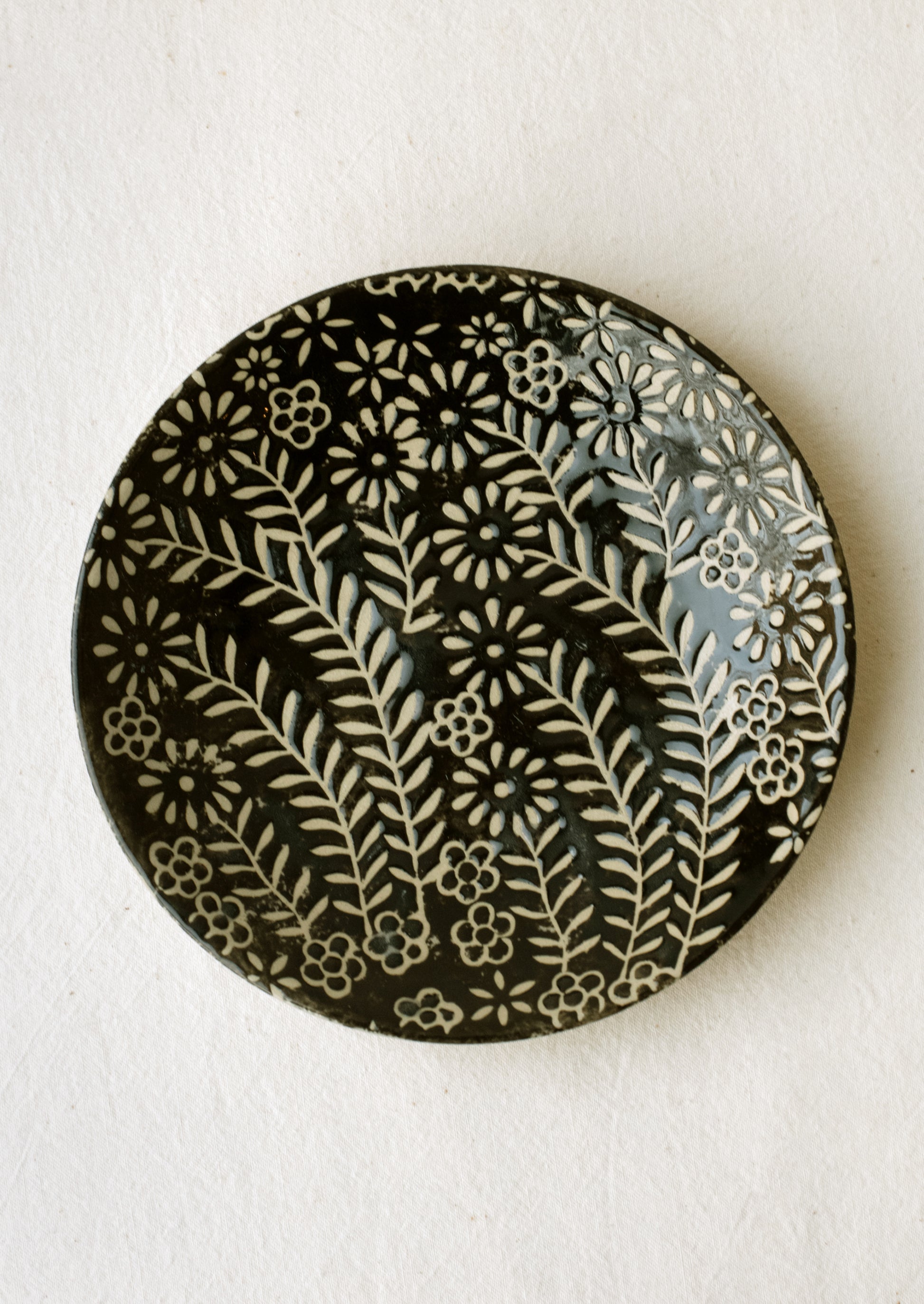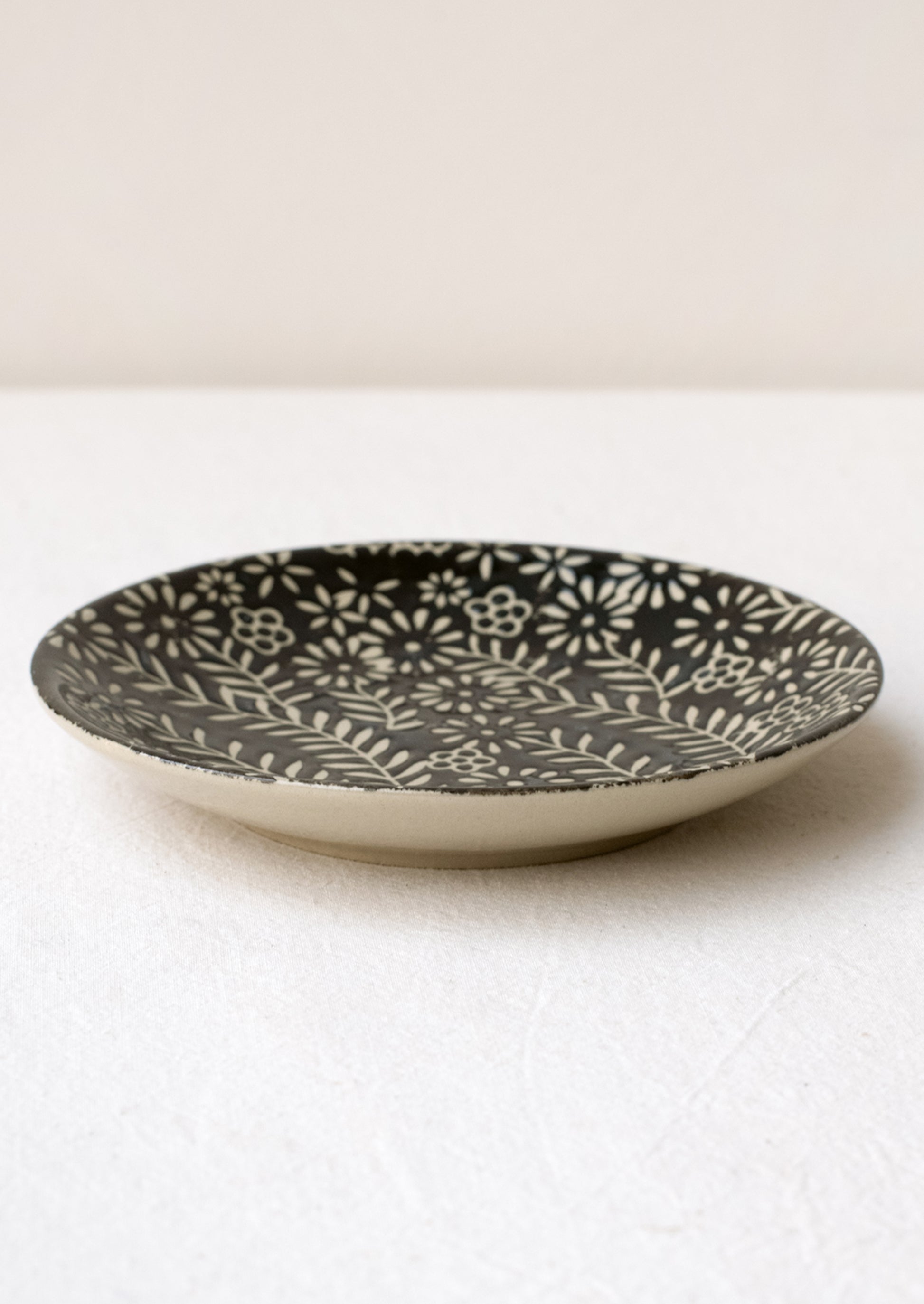 Showing off a floral wax relief pattern, this small ceramic plate lends a special feel to all sorts of snacks and sides.