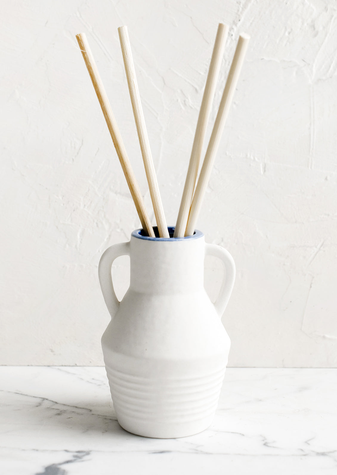 In a Grecian-inspired ceramic vessel, this fragrant reed diffuser can be repurposed as a bud vase.