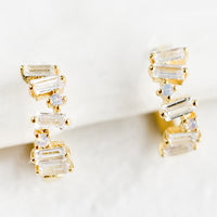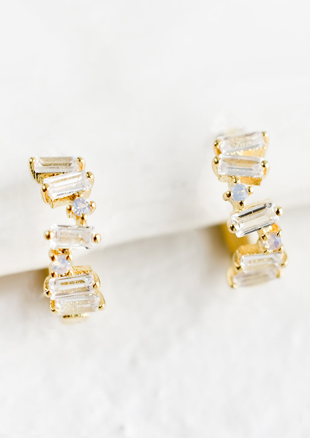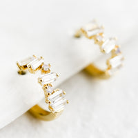 Crystal baguettes shine slightly askew on these golden huggie hoop earrings, packing a lot of sparkle into their small silhouette.