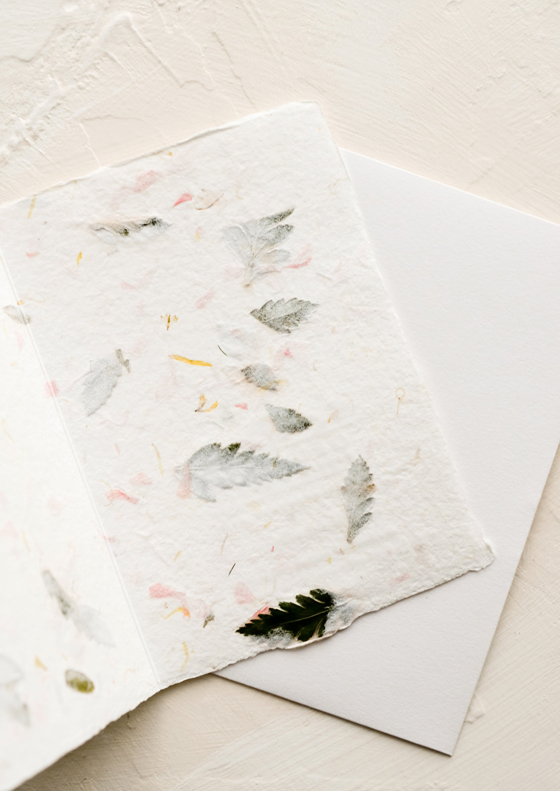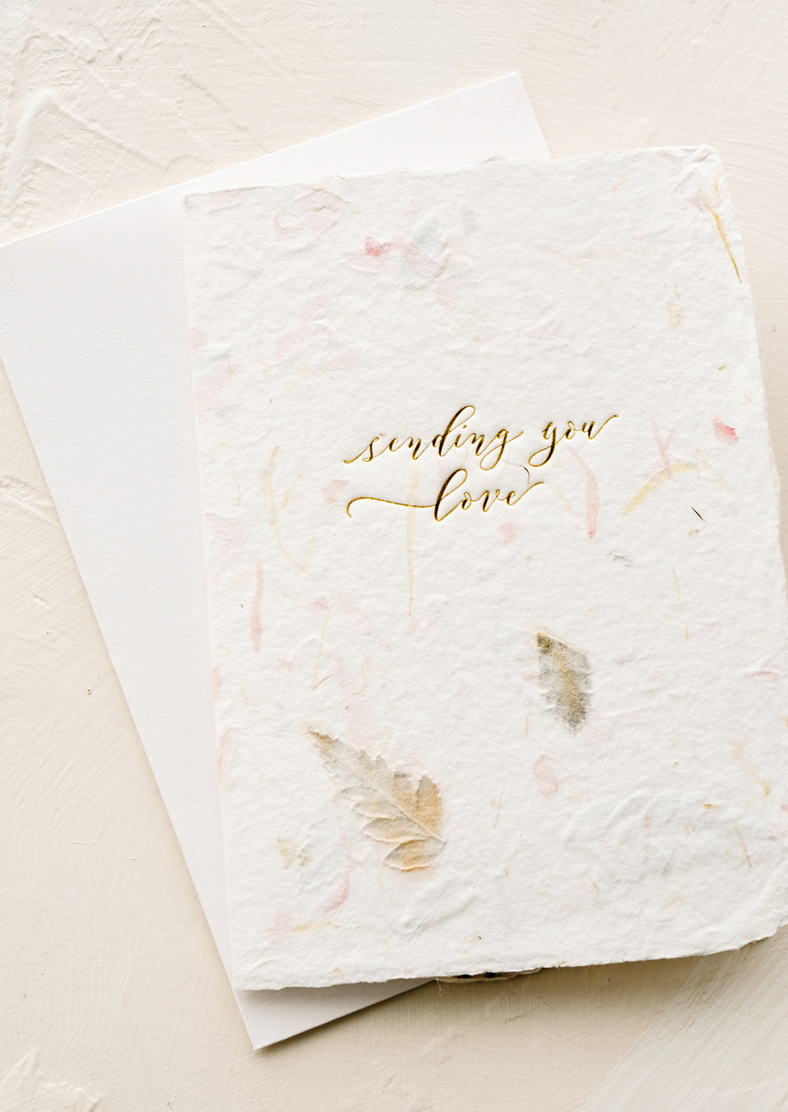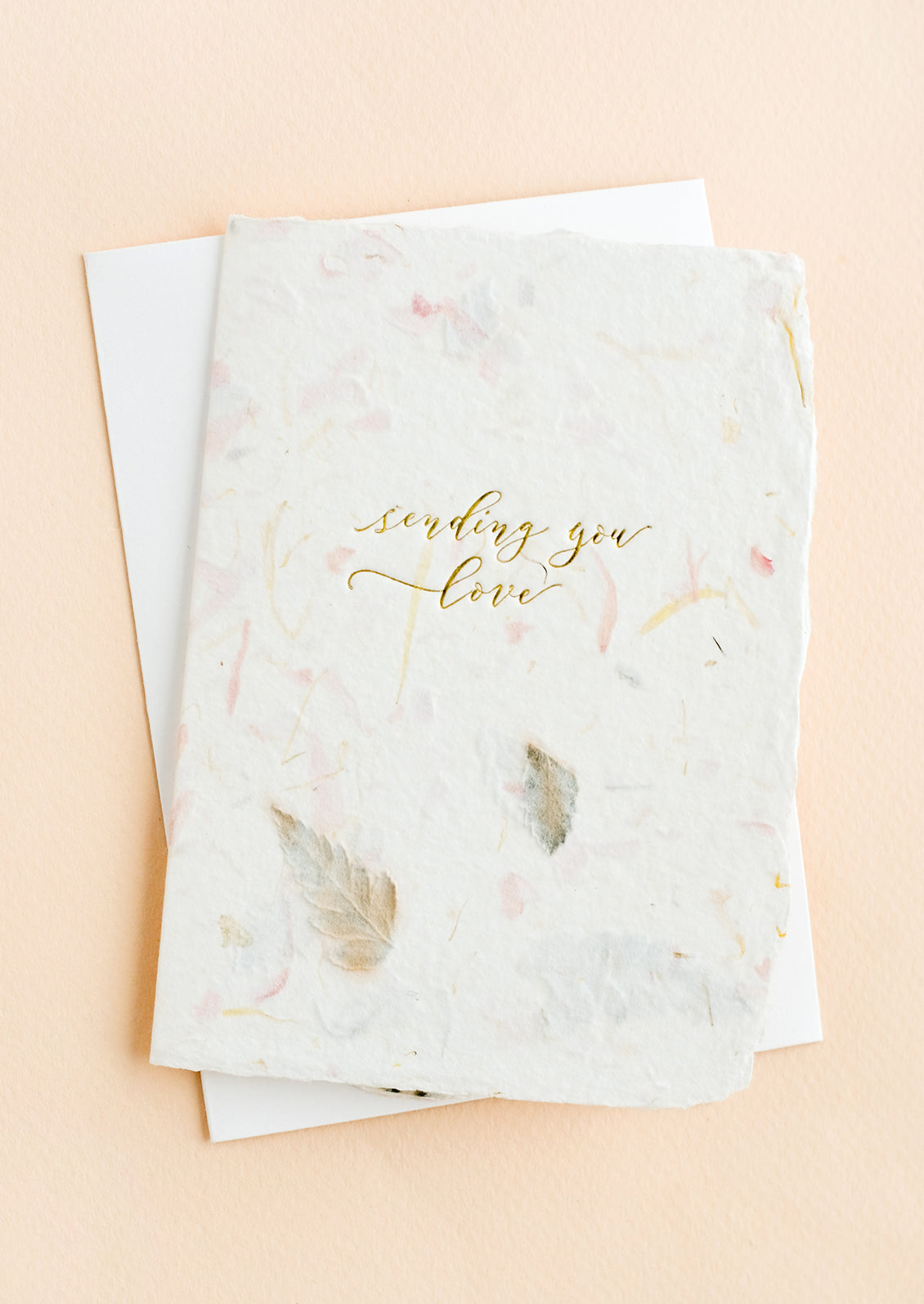 Crafted in handmade paper embedded with flower petals and fern leaf tidbits, this gorgeous greeting card is a work of art, perfect for sending love someone's way.