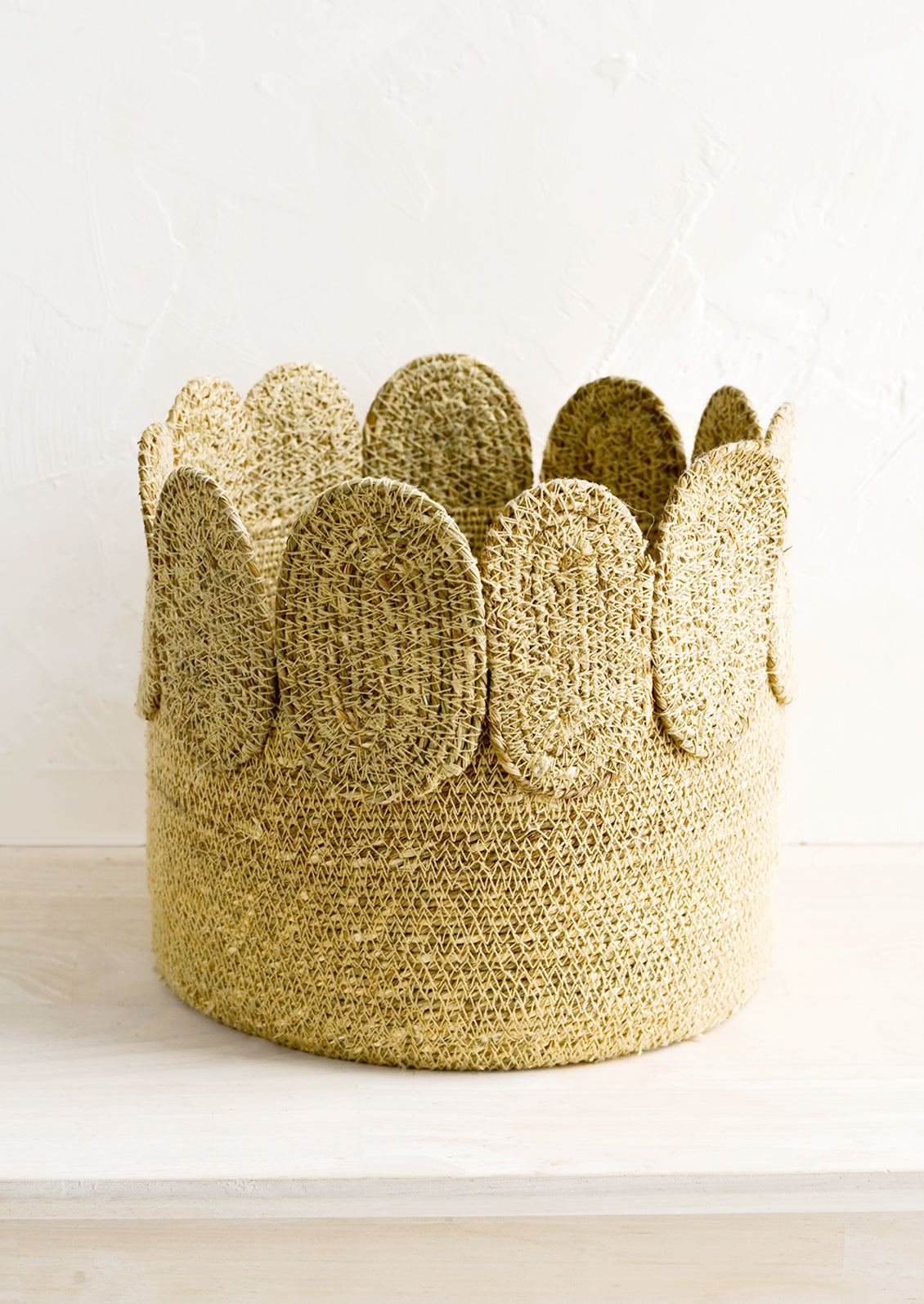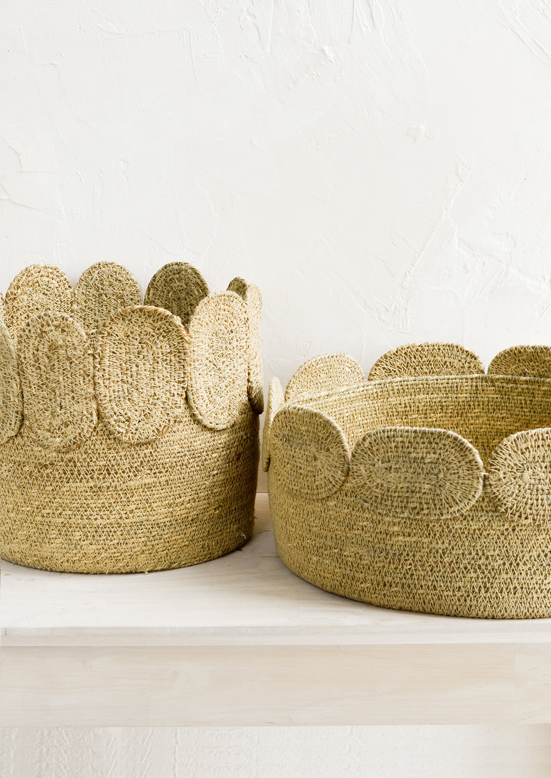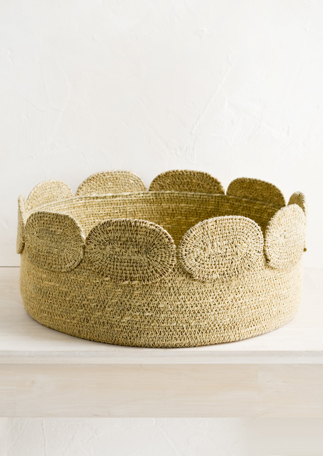 An oversized, oval-adorned rim gives a playful feel to this seagrass storage basket, available in a shallow and wide silhouette or a taller, more narrow shape.