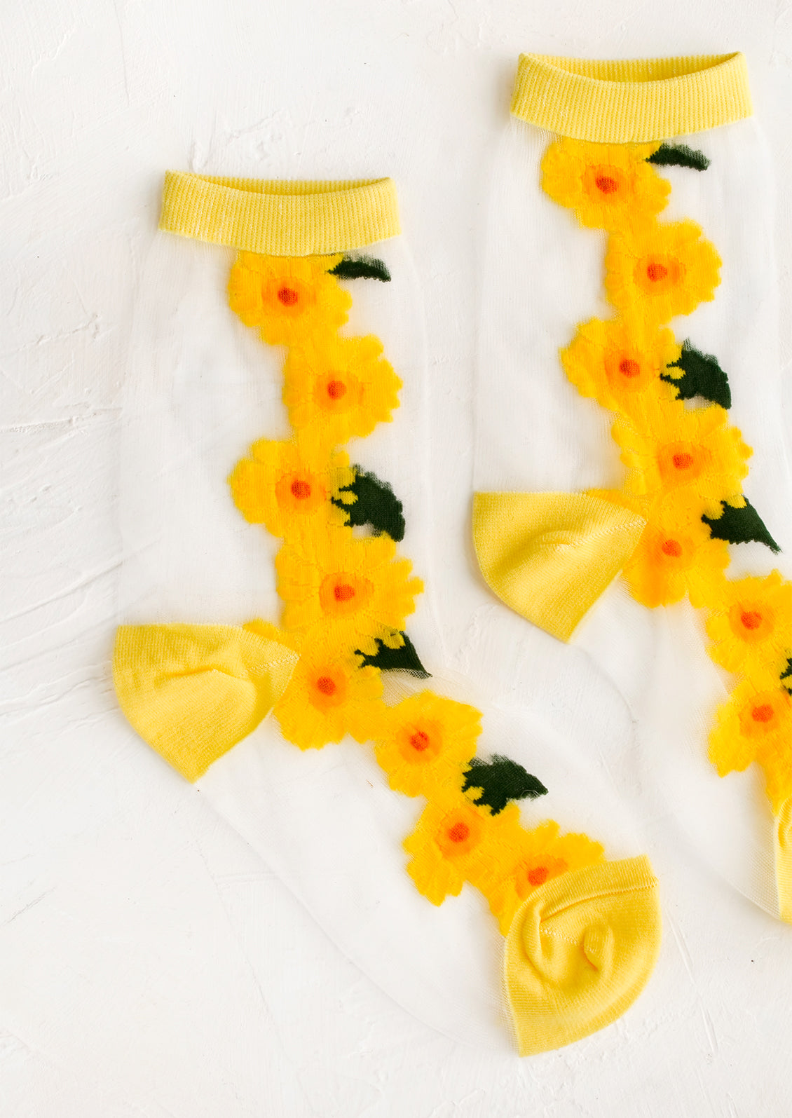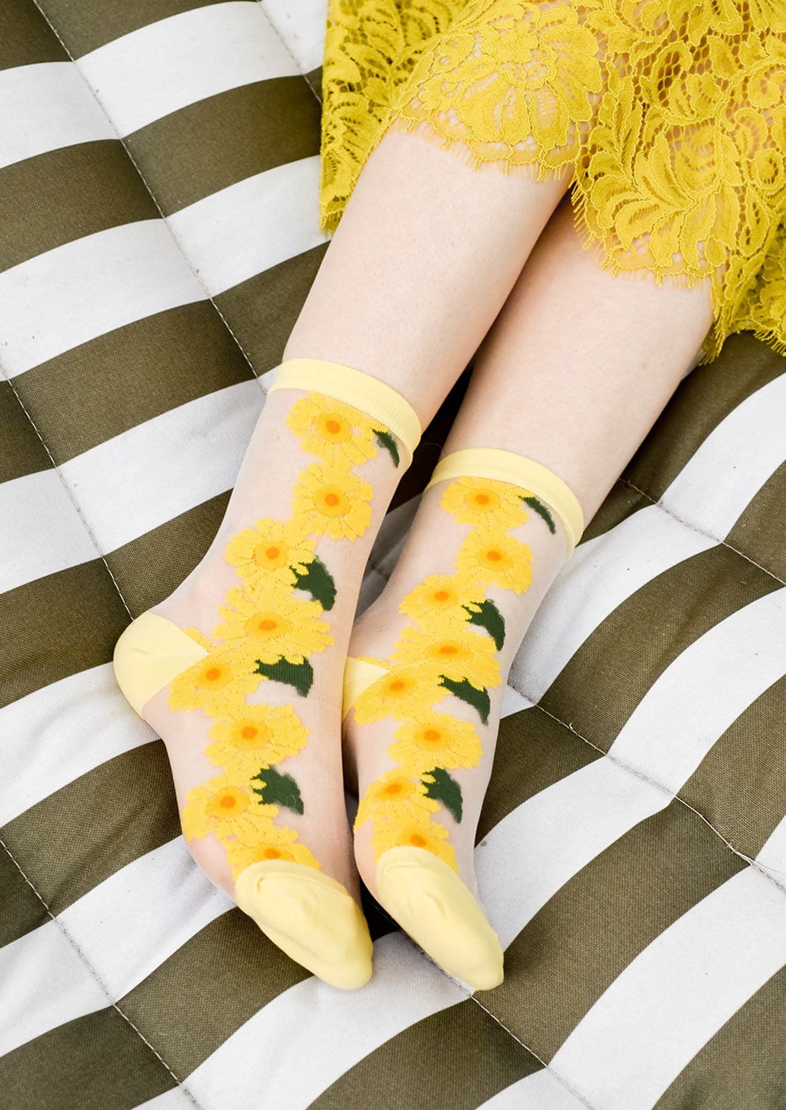 In sheer nylon mesh, these flattering, floral-clad socks (which hit just below mid-calf) dress up your legs with vibrant sunflowers.