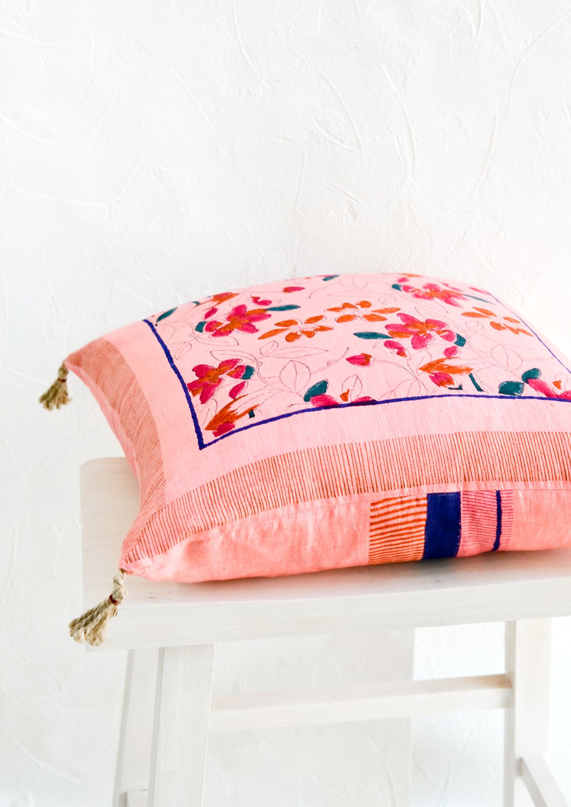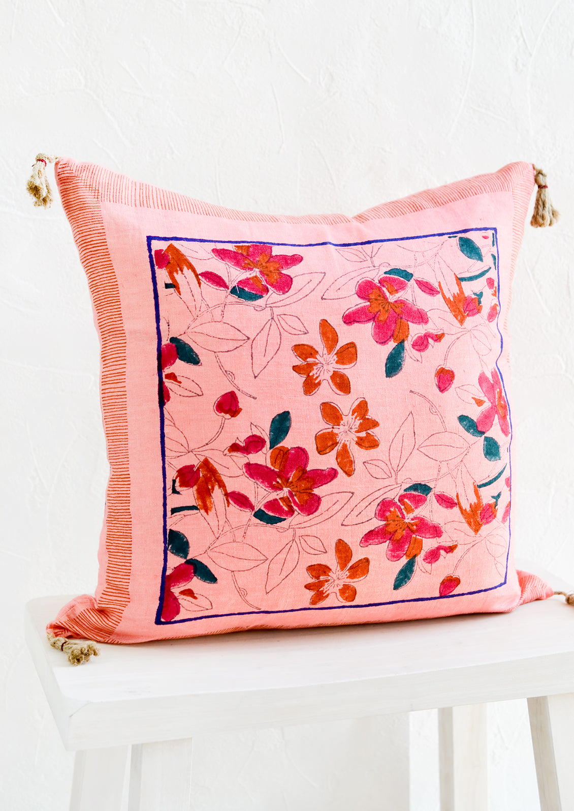 Block-printed by a small workshop run by a nephew and uncle team, this luxurious and expertly-crafted linen pillow exudes the meticulous work the artisans put into it. Its vibrant palette is inspired by the bold, lively colors worn by the local communities in the Thar desert.