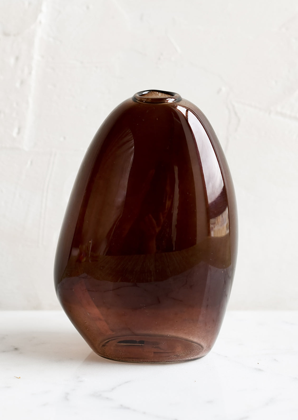 An asymmetric shape gives an unexpected look to this glass bud vase, rendered in carob-hued transparent glass.