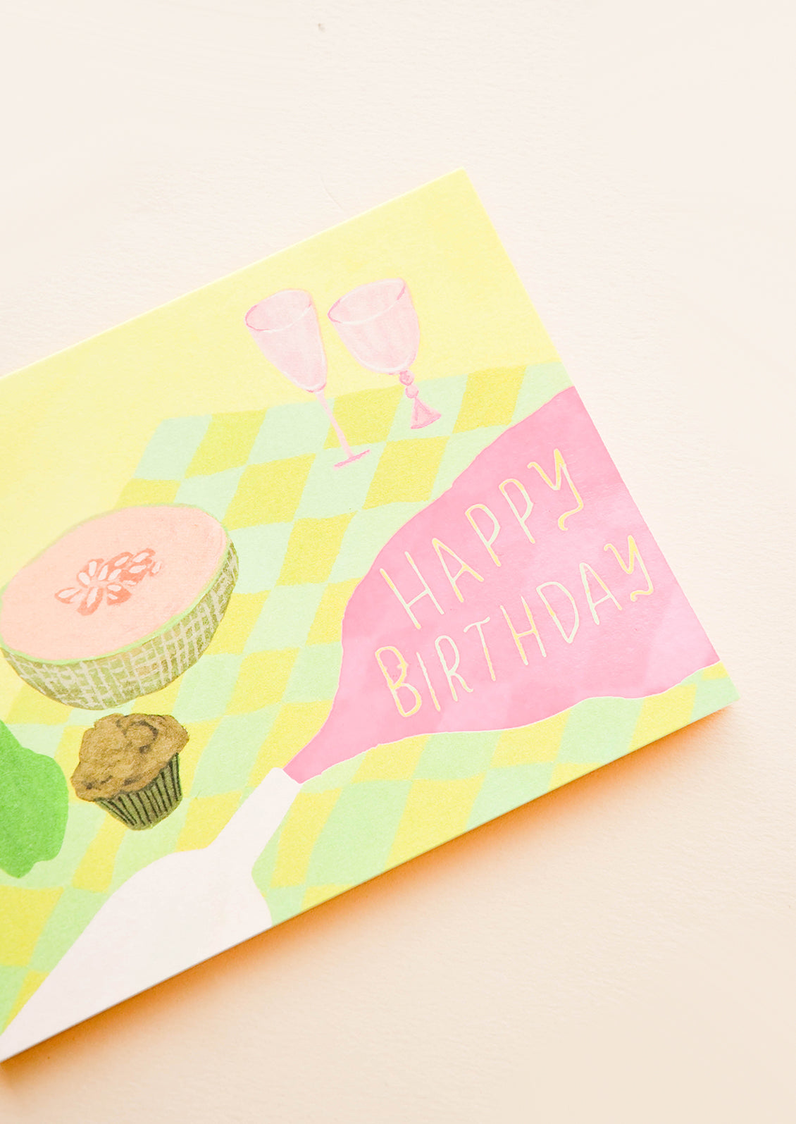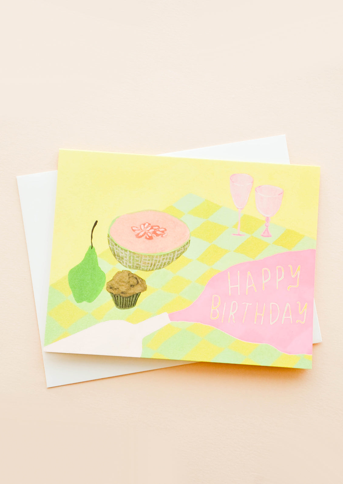 A neon pink puddle of spilled wine reveals a birthday message on this colorful, fruit-adorned card perfect for summer babies.