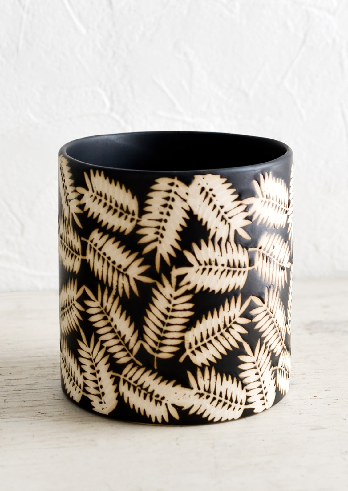 A palm leaf print (created using a resist technique) gives striking contrast to this botanical planter, crafted in smooth black ceramic.