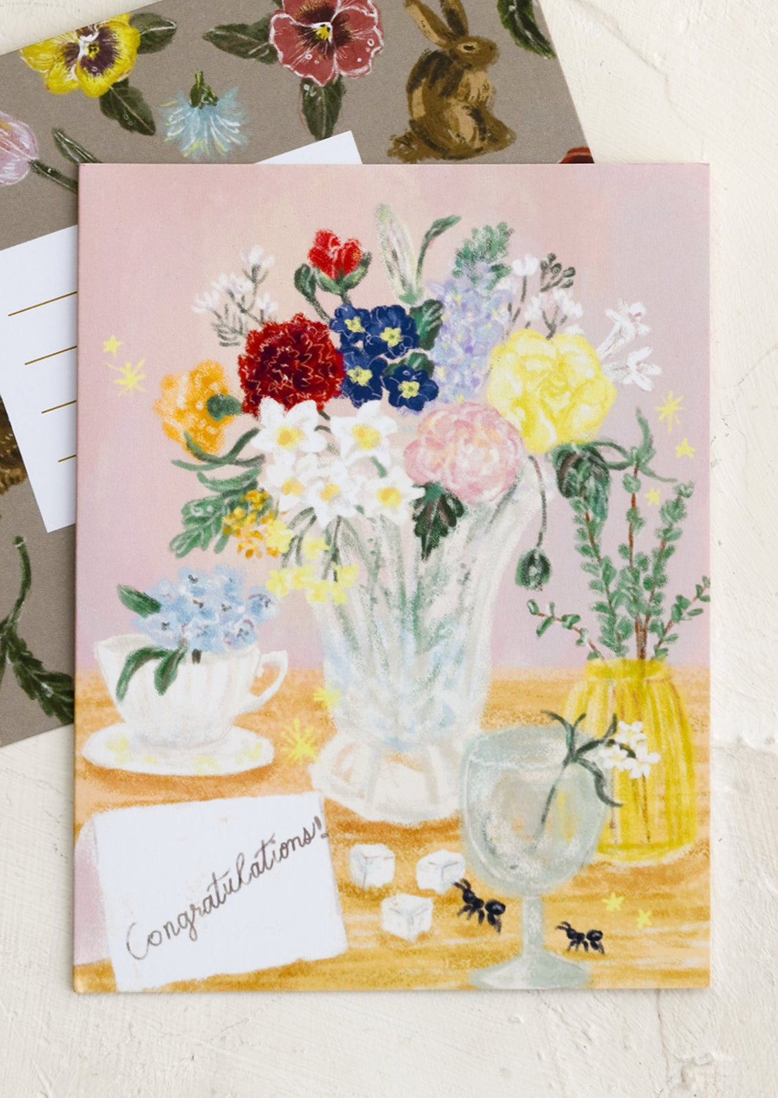 Little ants chase after sugar cubes on this floral-clad, tablescape print congratulations card, complete with a flora and fauna illustrated envelope.