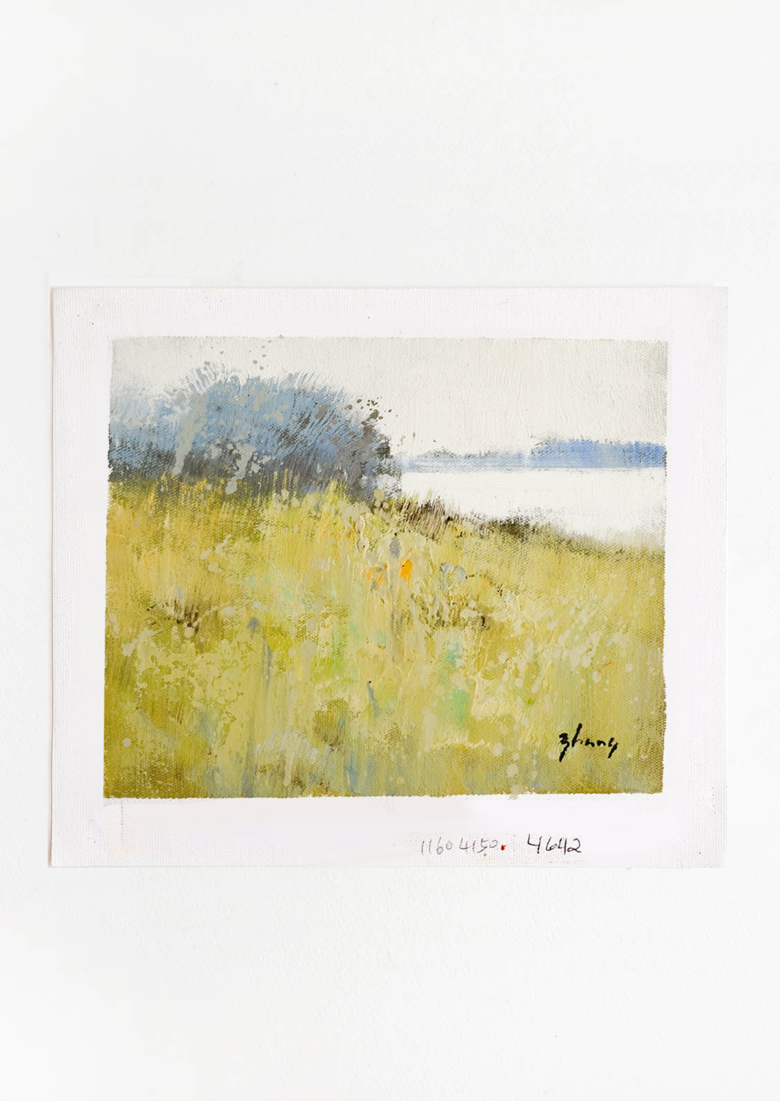 Painted on unstretched canvas, this original oil painting pictures a serene setting. Scored from an antique haul, the artist and the painting's origin remains unknown—but the thick, thoughtful brushstrokes, muted palette, and pastoral imagery allow this painting to exude a certain kind of mysterious magic.