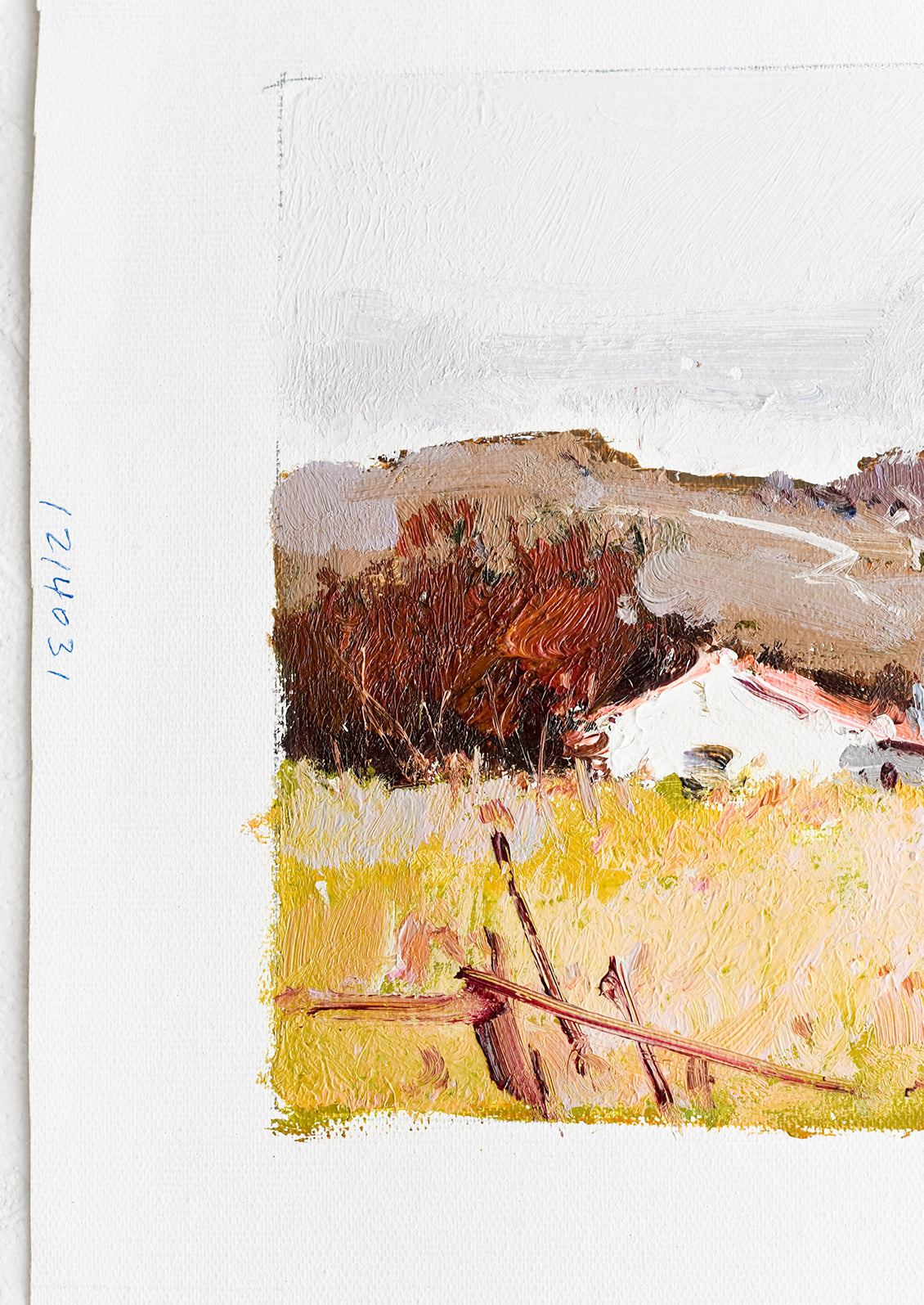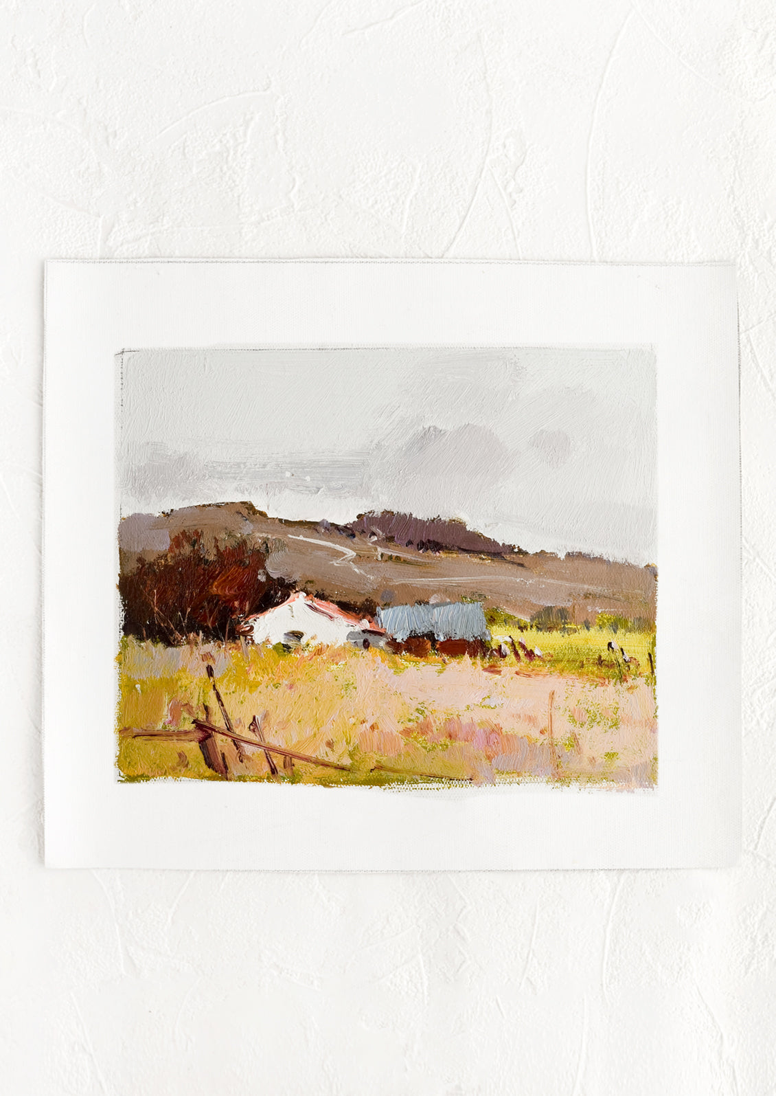 Painted on unstretched canvas, this original oil painting pictures a serene setting.  The artist and the painting's origin remains unknown—but the thick, thoughtful brushstrokes, muted palette, and pastoral imagery allow this painting to exude a certain kind of mysterious magic.