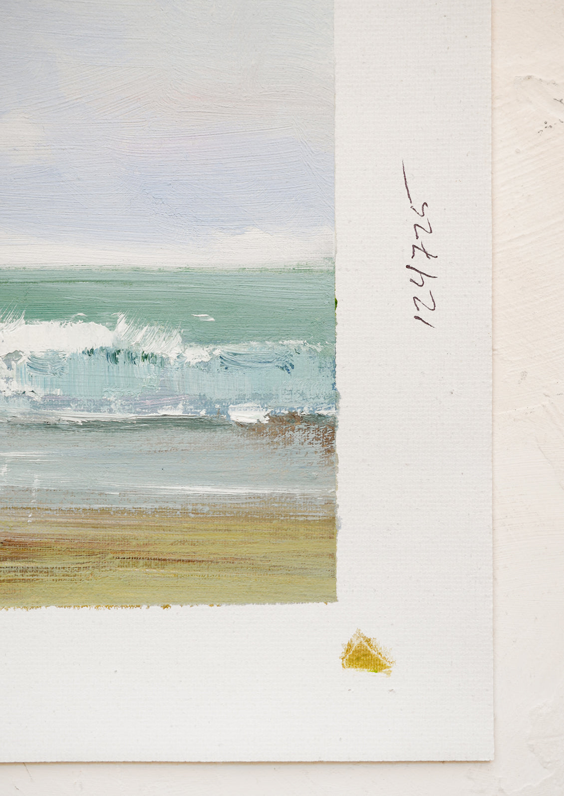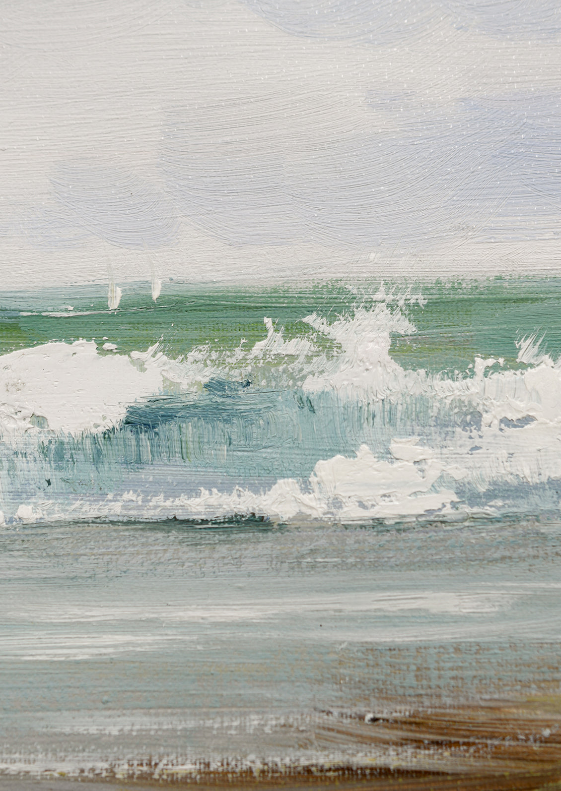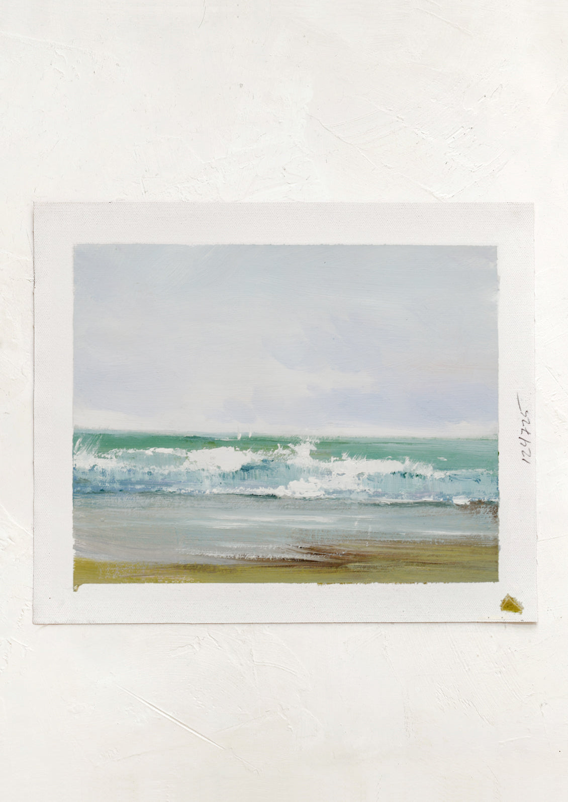 Painted on unstretched canvas, this one-of-a-kind, original oil painting pictures a serene setting — thick, thoughtful brushstrokes, a muted palette, and pastoral imagery allow this painting to exude a certain kind of artful magic.
