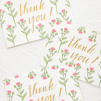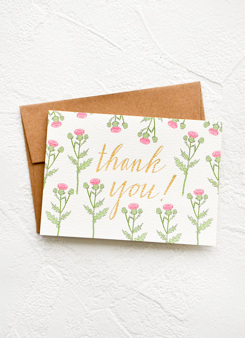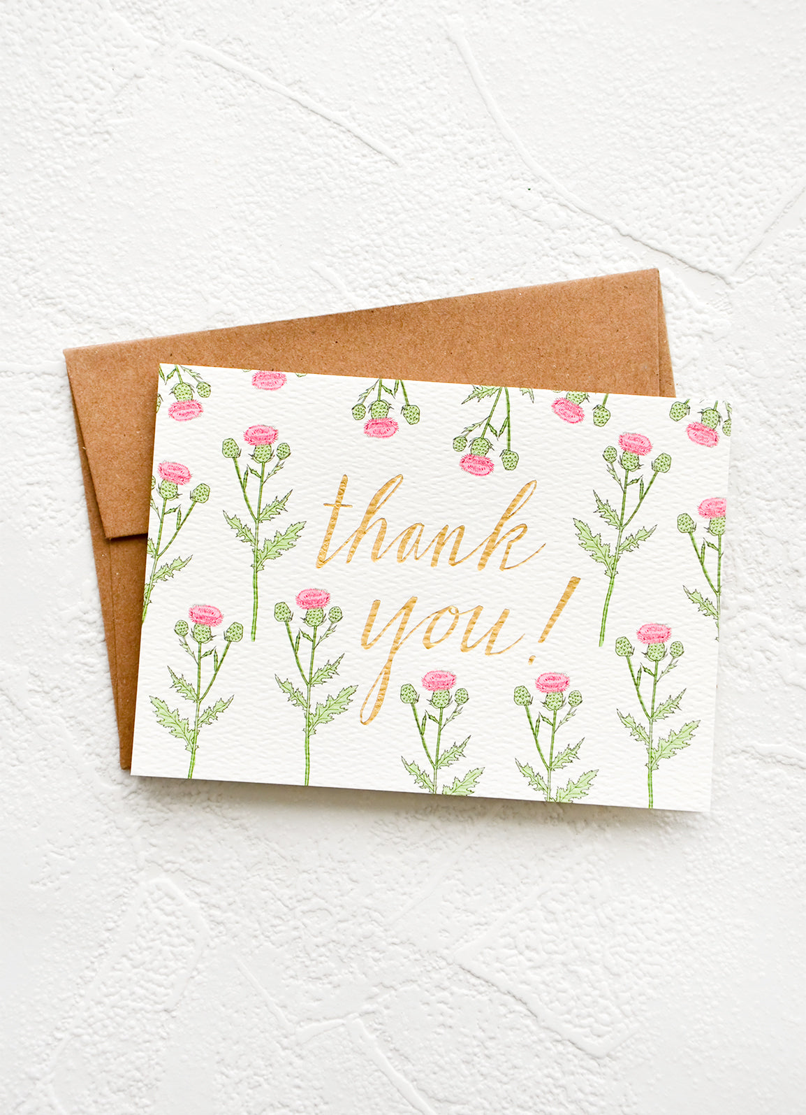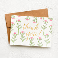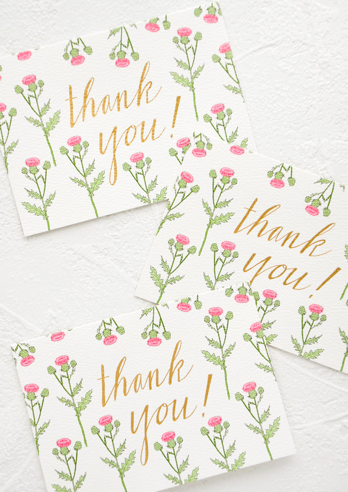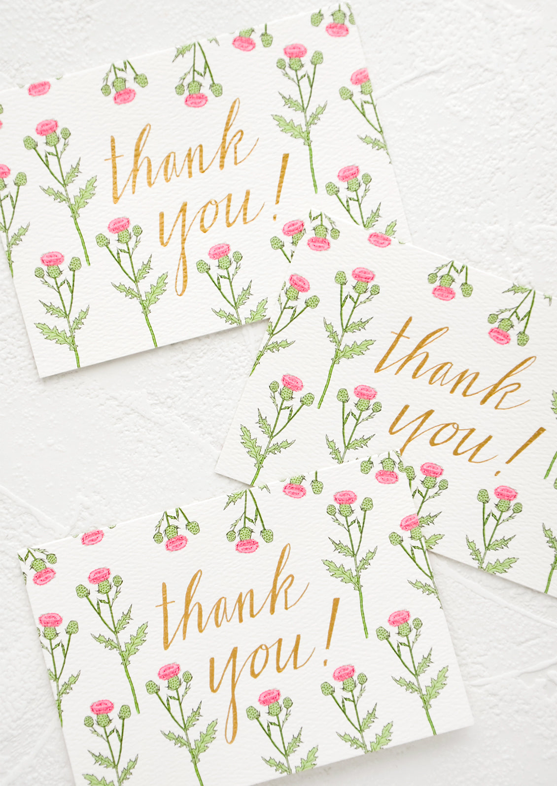 Vibrant pink thistles decorate this golden foil detailed card set, for sending gratitude with grace and beauty.
