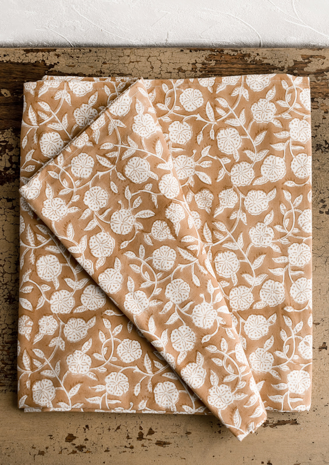 In a warm and classic brown and white palette, this block printed tablecloth shows off a rich and lively floral motif.