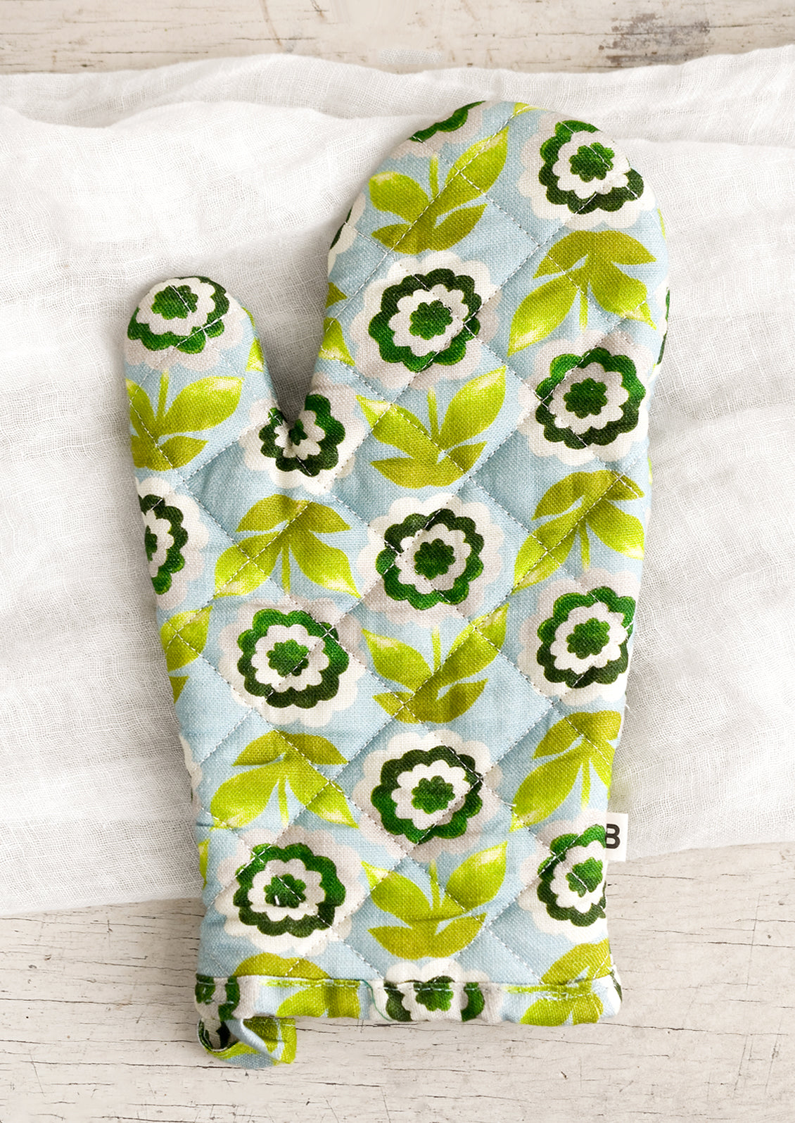 Screen printed from original artwork, this charming oven mitt shows off a natural, botanical palette of sky blue and earthy green. From Bonnie & Neil.