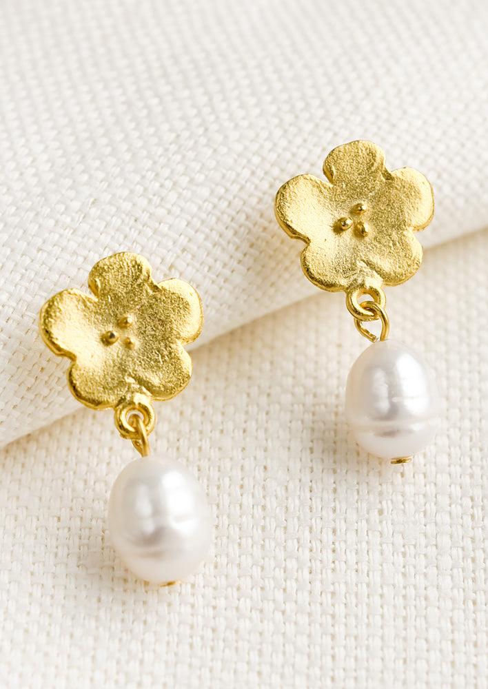 A treasured combination of flowers and pearls makes for a dreamy duo on these freshwater pearl earrings, crafted with a floral post in triple plated 24 karat gold.