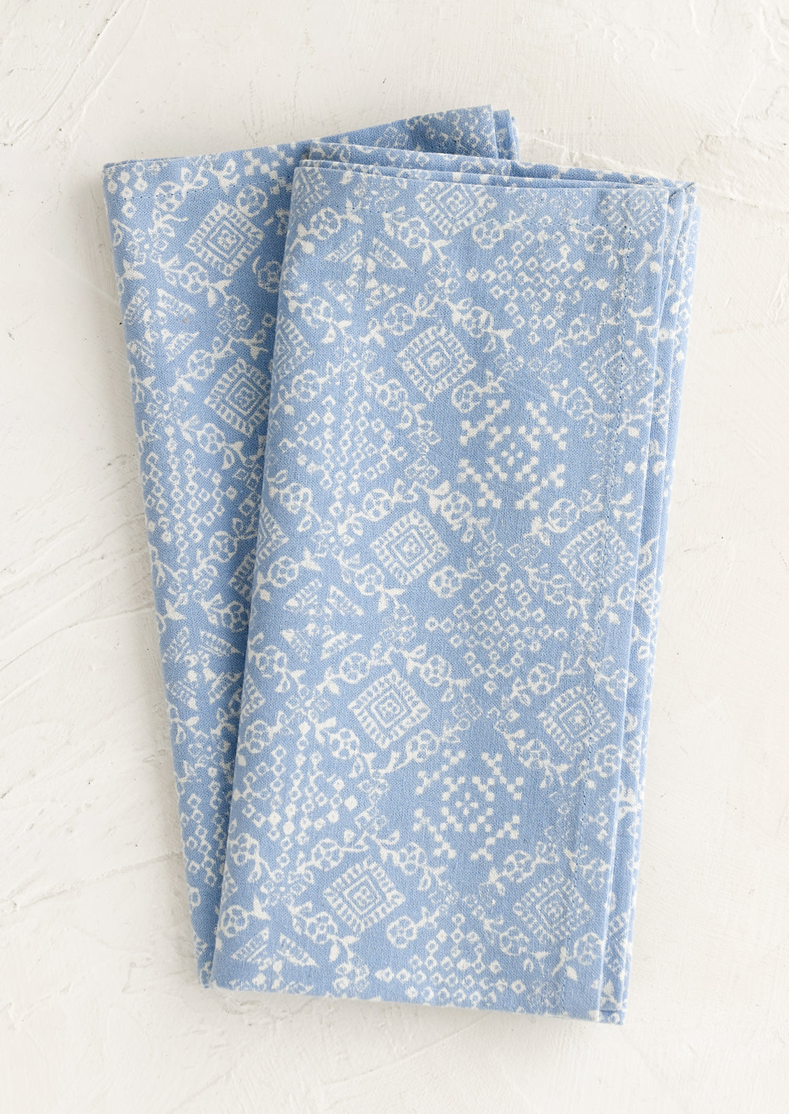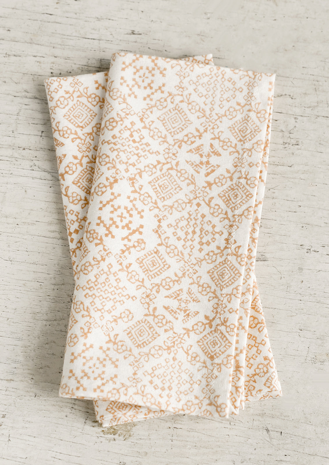 Hand block printed on organic cotton using AZO-free pigments, this fair trade napkin set shows off a worldly pattern.