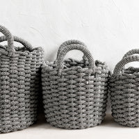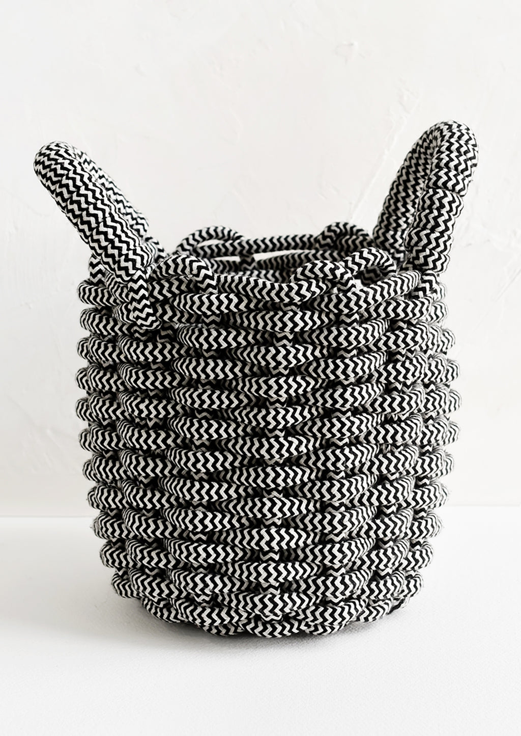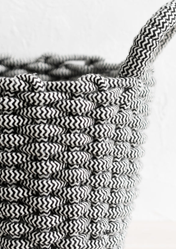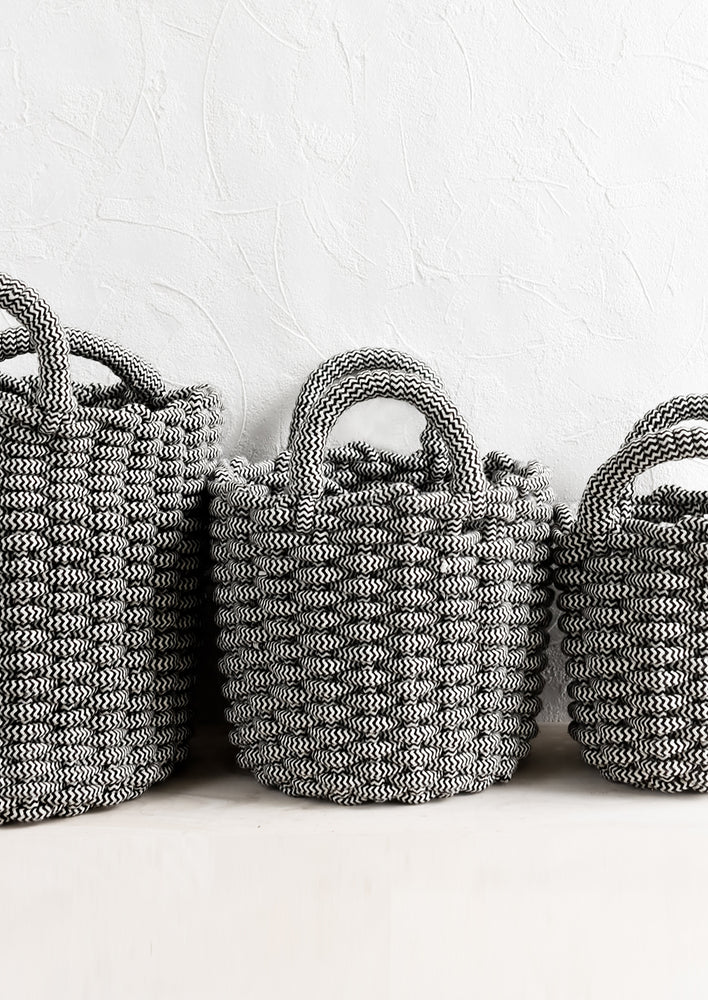 Soft cotton rope in a monochrome black and white zig-zag give a laidback, casual feel to this woven basket, offered in three sizes that nest together.