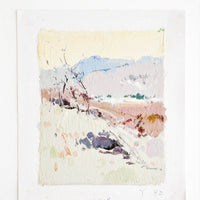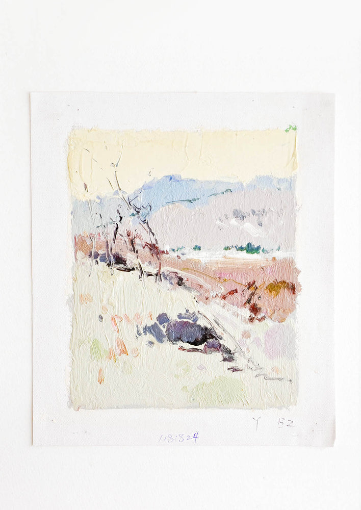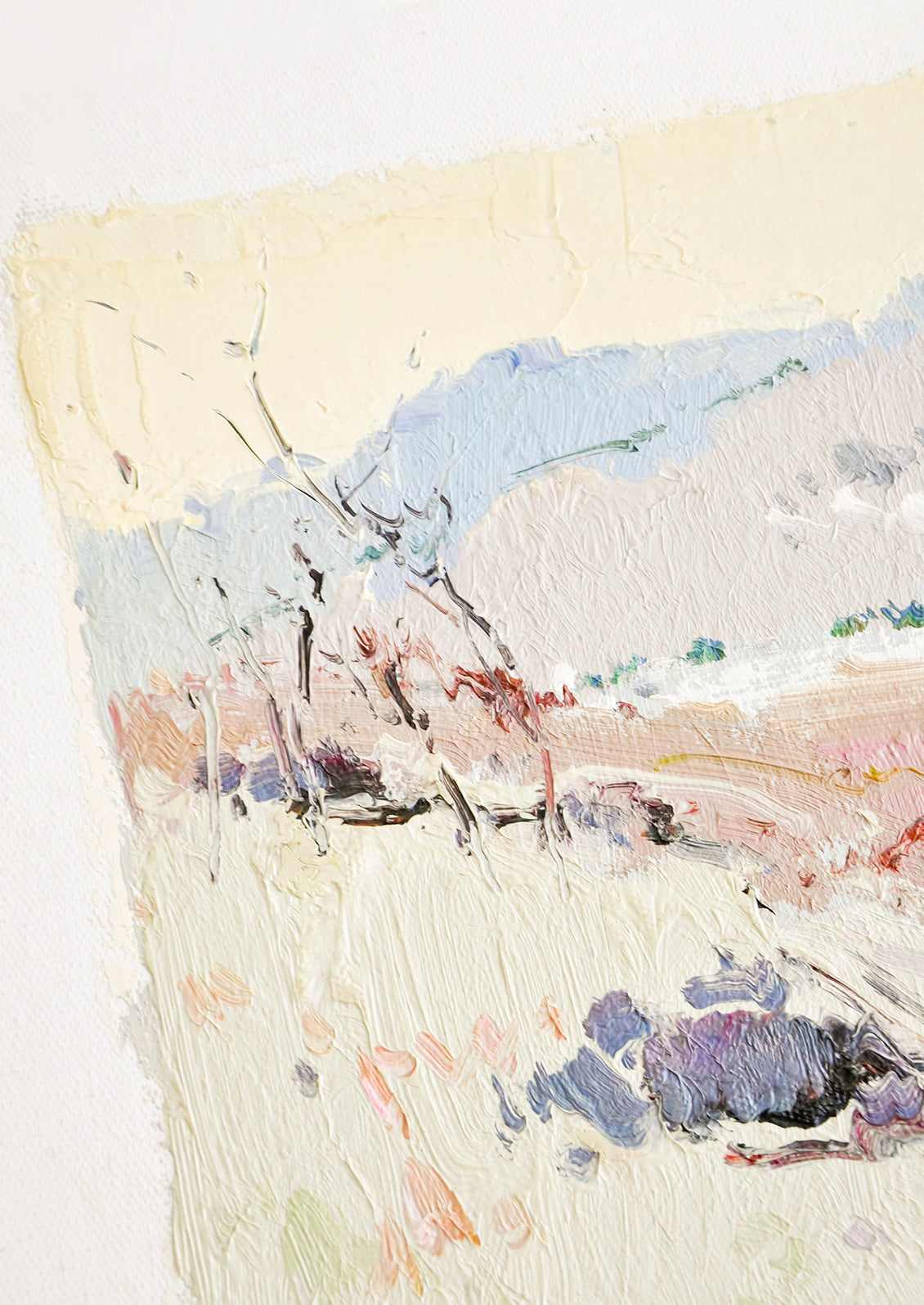 Painted on unstretched canvas, this original oil painting pictures a serene setting. Scored from an antique haul, the artist and the painting's origin remains unknown—but the thick, thoughtful brushstrokes, muted palette, and pastoral imagery allow this painting to exude a certain kind of mysterious magic.