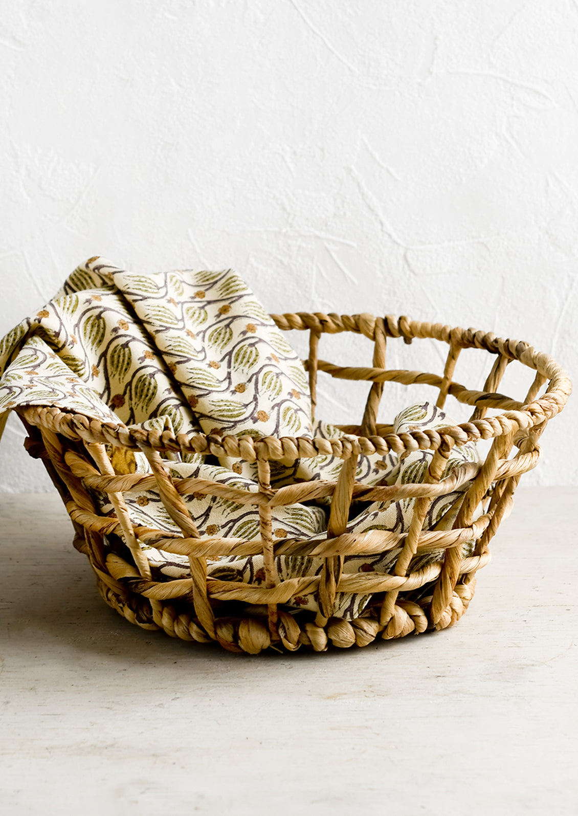 Natural water hyacinth takes on a grid-like pattern, forming an easy, breezy catchall basket for linens, toys, and more.